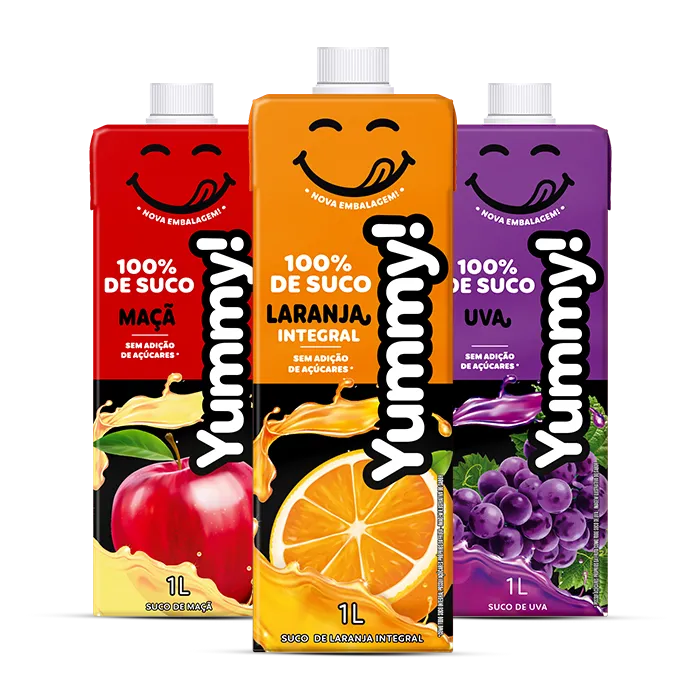 Aproveite o melhor da vida com 100% de sucos Yummy, Maçã, Laranja e Uva.
